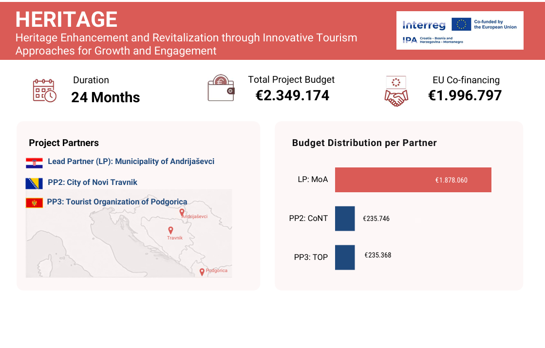 Projekt HERITAGE provodi se u snažnom međunarodnom partnerstvu, a Općina Andrijaševci kao vodeći partner u suradnji sa Gradom Novim Travnikom (Bosna i Hercegovina) te Turističkom organizacijom Podgorice (Crna Gora) kao projektnim partnerima.