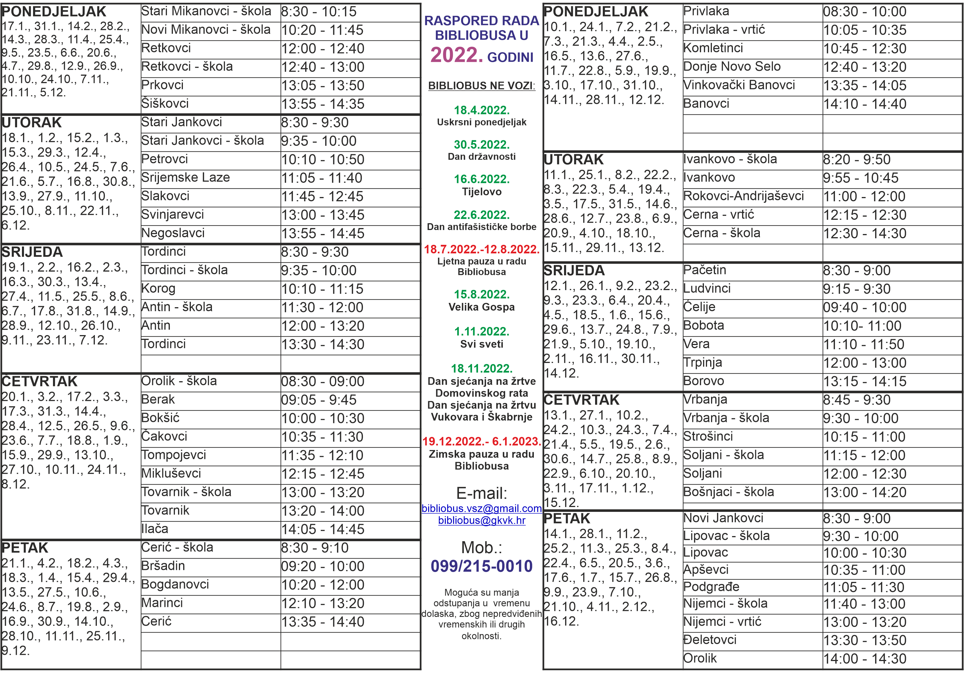 Rapored dolazaka Bibliobusa u Andrijaševce za 2022.godinu je UTORAK